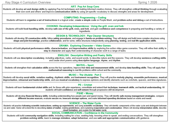 Key Stage 4 KS4 Spring 1 25-26 Overview Click image to enlarge. Curriculum Overviews 2025-26 Spring 1 123 KB Autumn 2 102 KB Autumn 1 87 KB 2024-25 Summer Term 2 96 KB Summer Term 1 131 KB Spring Term 2 97 KB Spring Term 1 88 KB Autumn Term 2 93 KB Autumn Term 1 97 KB 2023-24 Summer Term 2 119 KB Summer Term 1 121 KB Spring Term 2 89 KB Spring Term 1 81 KB Autumn Term 2 79 KB Autumn Term 1 80 KB